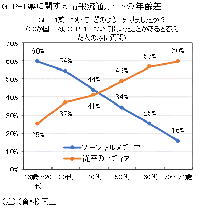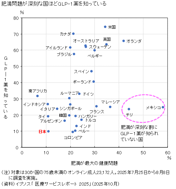 GLP-1薬はもともと糖尿病治療薬として開発されたが、2023年の初めに著名人が減量のためにこの薬を使用していることが知られるようになり、世間の注目を集めるようになった。オゼンピック、ウゴービ、ゼップバウンド、リベルサス、マンジャロなどのGLP-1薬は、ここ数年、肥満に悩む世界の人々にとって画期的な薬となっている。 GLP-1薬の影響は肥満に悩む国を中心に大きい。米国における肥満低減との関係は図録1912参照。 私の近著「統計で問いなおす はずれ値だらけの日本人」では次のように記述している。「米国人の肥満による死亡リスクは死者33万人以上にまで上っていたが、デンマークの製薬会社ノボ・ノルディスク社製やアメリカのライバル会社イーライ・リリー社製の新しいヒット減量薬(やせ薬)のおかげで、これまでどうしてもカロリーへの欲求を抑えられなかった消費者にもようやくそれが可能となると考えられている。モルガン・スタンレー銀行によれば2035年までに米国人の7〜9%が減量薬を服し、シリアルの需要が3%、アイスクリームが5%減少すると見積られているという(英国エコノミスト誌、2024年8月24日号)。減量薬のインパクトの大きさは上記2社の時価総額が2024年12月の時点で、それぞれ、19位と13位とグーグルなどの米国主要IT企業「ビッグテック」やテスラなどと並ぶ世界のトップランキング入りを果たしていることからもうかがい知ることができよう」(p.65〜67)。 日本で保険適用の肥満症治療薬が2024年2月に発売された。新たに発売された肥満治療薬「ウゴービ」は、週1回の注射で投与され、脳の満腹中枢に働きかけ空腹感を軽減し、食事の量を減らして体重を減らす働きがある。価格は最大容量2.4ミリグラムの投与で1カ月約4万円だ(図録5410)。 ![]() 前置きが長くなったが、GLP-1薬が国民にどれだけ知られているかを調べたイプソス社のデータによれば、図のように、日本は周知度10%と最低レベルの周知度となっている。一方、肥満に悩む米国では74%と非常に高い周知度となっている。 同じ調査で「肥満が最大の健康問題」と回答した人の比率とこのGDP-1薬の周知度との相関図を描いて見ると、相関度は高くないが、肥満が深刻な国ほどGDP-1薬が知られていることが分かる(ページ末尾図参照)。同時に、英語圏や北方圏の先進国では新薬であるGLP-1薬がよく知られており、アジアや途上国(ブラジルは例外)では余り知られていない傾向もうかがわれる。さらに、肥満が深刻な割に知られていないので商機が大きいと見なされる国としてマレーシア、チリ、メキシコなどが目立っている。 イプソス社のレポートでは、GLP-1薬が今後社会に及ぼす影響について以下のように述べている。社会的強制の懸念、上流の公衆衛生対策の弱化の懸念、誤情報による健康被害の不安など、GLP-1薬の社会的影響がマスコミなどでも議論されていない日本では思いつきにくい点にふれているので参照されたい。 「GLP-1を使用する動機は、健康そのものや美観(文化的には、より痩せている方がより健康的かつ魅力的であるという共通認識があるが)ではなく、肥満の汚名から逃れるためである可能性があります。文化的に、GLP-1は肥満の人々に体重を減らすよう強制することを強化する危険性があります。これにより、ワクチン接種を受けないことを選択した人々にさらなるプレッシャーがかかります。 多くの人がGLP-1を非常に高く評価していますが、コストと副作用のために使用を中止する人も多くいます。将来的には、消費者がGLP-1との長期的な関係を維持する方法を見つけるにつれて、「オンオフ」使用法やマイクロドージングなどの新しい遵守方法が見られるようになるかもしれません。 今後、さらに多くの医薬品が市場に投入され、大手企業が特許を失うにつれて、GLP-1はより普及していくと思われます。競争が激化し、最終的には価格が下がるでしょう。錠剤バージョンも利用可能になります。これにより、GLP-1が標準化され、一般的になり、スタチンと同じように予防的健康手段として使用される状況が生まれる可能性があります。しかし、GLP-1のこの商品化は、公衆衛生システムが上流で対処すべき問題を医療化および個別化してしまう危険性があります。これらには、緑地の整備、地域スポーツの促進、食糧安全保障、手に入りやすい新鮮な食品の提供などが含まれる可能性があります」。 さらにGLP-1薬に関しては、GLP-1薬について、どのように知ったかについて、ソーシャルメディアからという回答率が45%と従来のメディアの41%を上回っていた点が注目される(その他、家族・友人からが22%、医師など医療専門家からが19%、広告でが15%)。 年齢別に見ると、若い世代と高齢層とで大きな差がある。50歳までの人はソーシャルメディアからGLP-1について聞いたことがある割合が最も高いが、50歳を超える人は従来のメディアから知る割合が高くなっている。 ![]() イプソス社の報告書では、こうした状況の下で、著名人やインフル
