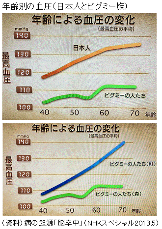 バブル経済の時期をはさんで1980年代後半から1990年代前半にかけて食塩摂取量の増加が一時期見られた。同時期に日本人の血圧はやはり一時的に上昇した(図録2175参照、なお以下には年齢調整平均血圧の推移の図のみ再掲)。食塩摂取量の増加が血圧の上昇をもたらしたと考えられる。バブル期のテンションの高さや贅沢志向が食生活にもあらわれ、これが血圧の上昇にも結びついていたのだとしたら、まさしくバブル狂想曲と呼ぶべき時代だったことが裏づけられよう(バブル期については図録2670参照)。 NHKスペシャルの病の起源「脳卒中」では、10gの塩分摂取で血圧が高くなっている日本人と1gしか塩分を摂らないピグミー族の血圧の低さを対比し、塩分摂取の影響を明らかにしている。人種的要因というより食の生活習慣の要因が大きいことは、同じピグミー族でも町に移住し、塩分の多い食生活に馴染んだ者は日本人並みに血圧が高くなることから明らかである(図録2174からの再録)。 ![]() ![]() (2012年6月5日収録、6月6日1974年以前推計値付加、6月7日推計方法、7月9日更新、2013年5月27日更新、9月30日鳥居引用追加、2014年6月23日更新、10月10日コメント改訂、2015年12月9日更新、2016年12月13日更新、「塩分の多い食事かどうか」追加、2017年5月26日地域別の食塩摂取量更新、2018年4月17日地域別の食塩摂取量のグラフを図録2173aとして独立化、佐々木敏引用、2018年7月10日更新、7月21日データ改訂・男女年齢別カロリー当り追加、2021年8月19日更新)