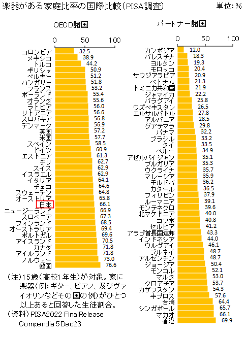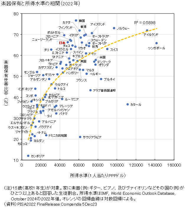 どんな楽器の保有を調べているかと言うと、各国、ギターとピアノは共通で、その他、国によってヴァイオリンなどその国で普及している楽器をひとつ加えた中から1つ以上を有しているかの保有率である。 この楽器保有率は、どの国がどれだけ音楽好きかをあらわしているとともに、ピアノが対象とされていることからうかがえるように、楽器を有するだけの所得水準に達しているかどうかの要素の影響も反映していると考えられる。 日本は66.1%と約3分の2の家庭で楽器を保有している。OECD諸国の中でも11番目の高さであり、日本人はまあ音楽が好きな国民なのだと言えよう(下段の所得水準との相関分析参照)。 OECD諸国の中で最高は韓国の76.6%であり、韓国人の音楽好きが目立っている。 2位以下はノルウェー、アイルランド、カナダ、アイスランドと北方諸国が続いている。気候が寒い冬には家で楽器を楽しむ生活習慣が普及するのだろうか。逆に、ギリシャ、フランスの楽器保有率が低いのは暖かい気候だから家で楽器を楽しむより屋外で自然と親しんだ方がよいからかもしれない(図録3956aの読書率も同様)。 主要先進国(G7、韓国)の順位を低い方から並べると以下である。 1.フランス 53.2% 2.英国 57.2% 3.米国 57.7% 4.ドイツ 60.9% 5.イタリア 64.1% 6.日本 66.1% 7.カナダ 71.8% 文化度が高いと思われているフランスは意外と低い。最高はカナダである。美術品の保有と同様なのも興味深い。 OECD以外の調査パートナー諸国はOECD諸国より全体として値が低いが値のばらつきはやはり大きい。最低はカンボジアの12.0%、最高は香港の39.9%である。 香港の次いで高い保有率なのは、マカオ、シンガポール、台湾の順である。OECD諸国の韓国、日本を合わせ、儒教圏諸国で楽器保有率が高い点が目立っている。儒教では伝統的に音楽を修養を媒介する重要な存在としてきたことがこうした結果を生んでいるとも考えられる。 (注)儒教において、音楽は「礼」(礼儀作法)と対をなす「礼楽思想」の中心であり、人々の心を正しく導く重要な役割を担っているとされた。 孔子は音楽を格別の存在と考えていた。論語述而編には「子、斉にありて韶(しょう、古代の舜の時代の管弦楽)を聞く。三月、肉の味わいを知らず」とある。 また、音楽を楽しみの手段以上の社会的人格形成の手段と見ていた。論語泰伯編には「子曰く、詩に興こり、礼に立ち、楽になる」とある。これは、詩に興こり(詩経による正しい感情の高揚)、礼に立ち(礼による人間秩序の法則づけ)、楽になる(音楽を通じ、法則による感情の整理を行い、人間性の包括的完成に至る)という教養の順序をあらわすものとされる(吉川幸次郎「論語上」p.214、262)。 経済発展度をあらわすIMFデータの2022年PPPドル・ベースの1人当たりGDPとここでの楽器保有世帯比率とのR2値(対数相関)を算出すると0.5898とかなりの相関、すなわち生活に余裕があるほど楽器を家に有する傾向となっている。 下図には所得と楽器保有比率の相関図(相関曲線は対数相関)を描いてみた。相関曲線より上に位置する国は音楽好き、下に位置する国はそうでないと考えることができよう。北方圏諸国や日本のほか儒教圏諸国で楽器保有比率が所得水準で相応の比率以上に高く、逆に産油国で低くなっているように見える。 ![]() 対象となった諸国は、OECD諸国、パートナー諸国の図の順にコロンビア、メキシコ、トルコ、ギリシャ、ベルギー、ハンガリー、フランス、ポーランド、オランダ、ラトビア、リトアニア、スロバキア、デンマーク、英国、米国、スペイン、ドイツ、エストニア、チリ、スイス、イスラエル、イタリア、チェコ、スウェーデン、オーストリア、日本、ニュージーランド、スロベニア、フィンランド、オーストラリア、ポルトガル、アイスランド、カナダ、アイルランド、ノルウェー、韓国、カンボジア、パレスチナ、ヨルダン、モロッコ、サウジアラビア、ベトナム、ドミニカ共和国、ジャマイカ、パラグアイ、ウズベキスタン、エルサルバドル、アルバニア、グアテマラ、パナマ、ブラジル、タイ、ペルー、アゼルバイジャン、ブルガリア、ウクライナ、マレーシア、モルドバ、カタール、フィリピン、ルーマニア、モンテネグロ、北マケドニア、コソボ、セルビア、アラブ首長国連邦、インドネシア、ウルグアイ、ブルネイ、アルゼンチン、ジョージア、モンゴル、マルタ、クロアチア、カザフスタン、キプロス、台湾、シンガポール、マカオ、香港である。 (2025年10月22日収録)