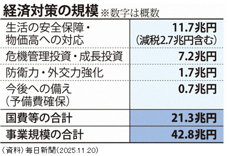 「政府が21日にも閣議決定する経済対策で、裏付けとなる2025年度補正予算案の歳出と大型減税の効果額が計21.3兆円程度になることが20日、明らかになった。地方自治体や民間企業の支出分なども含めた事業規模は計42.8兆円程度を見込む。一般会計の歳出規模は17.7兆円程度とコロナ禍後の23年度以降では最大になる見通しで、高市早苗政権の財政拡張路線が改めて鮮明になっている。 高市政権が掲げる重点施策では、生活の安全保障・物価高への対応11.7兆円程度▽危機管理投資・成長投資7.2兆円程度▽防衛力と外交力の強化1.7兆円程度――をそれぞれ充てる。 国会審議を経ずに内閣の裁量で使途を決められる予備費は7000億円程度を積み増す。自然災害の発生や更なる物価高、クマの被害拡大などに備える。 大型減税は、所得税がかかり始める「年収の壁」の引き上げで1.2兆円程度、ガソリン・軽油に上乗せされている暫定税率の廃止で1.5兆円程度の効果額をそれぞれ見込む」(毎日新聞2025.11.20)。 ![]() (石破内閣の2024年11月の総合経済対策) 政府が11月22日の臨時閣議で決定した「新たな経済対策」によると「賃上げと投資がけん引する成長型経済への移行を確実なものにする」として、▽賃上げ環境の整備などを通じた日本経済・地方経済の成長▽物価高への対応▽国民の安心・安全の確保を柱に掲げている。 主な事業としては、▽来年1月から電気・ガス料金の補助を再開し3月まで行うことや▽住民税の非課税世帯を対象とした給付金の支給▽能登半島地震の被災地のインフラ復旧や生活再建の支援策などを盛り込んでいる(NHK、2024.11.22)。 (岸田内閣の2023年11月の総合経済対策) 政府は11月2日午後の臨時閣議で賃上げ・国内投資の促進を盛り込んだ総合経済対策を決めた。物価高対策として所得税と住民税の減税や低所得者向け給付を入れた。国と地方自治体、民間投資をあわせた事業規模は37.4兆円程度、減税と裏付けとなる補正予算を含め17兆円台前半になる。財源の裏付けとなる2023年度補正予算案の一般会計は13.1兆円ほどを計上する。11月中にも提出し、臨時国会中の成立をめざす。 (岸田内閣の2022年10月の総合経済対策) 政府は10月28日、物価高への手当てを中心とした総合経済対策を閣議決定した。当初は補正予算案を25兆円程度とする方向で調整していたが、自民党内から増額を求める声が噴出し、新型コロナ・物価高対策予備費と「ウクライナ情勢経済緊急対応予備費(仮称)」の新設で計4兆7000億円を積み増したという(東京新聞)。 ![]() (岸田内閣の2022年4月の物価高に対する総合緊急対策) 政府は2022年4月26日、原油高や物価上昇に対応するための「総合緊急対策」を決定した。ガソリンへの補助金など原油高対策に1.5兆円を充てるなど、国費の負担として計6.2兆円を計上。金融機関の融資や民間の投資も含めた事業規模は13.2兆円を見込む。ロシアによるウクライナ侵攻などに伴う物価上昇や長引く新型コロナウイルス禍の影響緩和を図るものとされている。 ![]() (岸田内閣の2021年11月のコロナ経済対策) 政府は2021年11月19日の臨時閣議で、新型コロナウイルス禍の長期化などに対応する新たな経済対策を決定した。 「国・地方の歳出と財政投融資を合わせた財政支出は過去最大の55.7兆円に上り、民間支出などを含む事業規模は78.9兆円。岸田文雄首相が「成長と分配の好循環」を掲げる中、18歳以下への10万円相当の給付や事業者支援策などが盛り込まれ、規模が膨張した(事業内容は下図参照)。 対策の経済効果について、内閣府は実質GDP(国内総生産)を5.6%程度(30兆円強)押し上げると見込む。岸田首相は臨時閣議に先立ち開かれた経済財政諮問会議で「コロナ禍で傷んだ経済を立て直し、社会経済活動の再開を後押しし、経済を一日も早く成長軌道に乗せていく」と強調した。 国費は43.7兆円で、財源は赤字国債の発行などにより2021年度補正予算案や22年度予算案で確保し、「16カ月予算」として一体的に編成する。鈴木俊一財務相は臨時閣議後の記者会見で「国債がどの程度の規模になるか申し上げる段階ではない」と述べた。補正予算案は一般会計で31.6兆円、特別会計で0.4兆円を計上し、年内成立に向け今月26日の閣議決定を目指す」(時事通信2021.11.19)。 ![]() (菅政権の2020年12月の追加経済対策) コロナ対策の追加措置とコロナ後(ポストコロナ)の経済構造の転換と国土強靭化の3本柱からなる2020年における追加の経済対策が12月8日の臨時閣議で決定した。一般会計や財政投融資など財政支出は40兆円、金融機関の融資などを含めると事業規模は73兆6千億円にのぼる。月内に閣議決定予定の2020年第3次補正予算案と21年度当初予算案に、国費として計30兆6千億円を計上する。 (新型コロナ感染症に対する安倍政権2020年4月〜5月経済対策) 首相が「世界でも最大級の経済対策」と強調する「新型コロナウイルス感染症緊急経済対策」が4月7日の臨時閣議で決定された。補助を受けて民間企業が支出すると見込んだ額、納税・社会保険料猶予額など