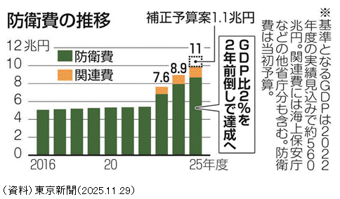 一方、トランプ大統領はEUに対して「自分の身は自分で守れ」とばかりに対GDP比5%の軍事費を要求している。日本に対しても日米安全保障条約は片務的とまで言うようになった。 現在、中国の台頭によるパワー・バランスの変化、ロシアによるウクライナ侵略を背景にNATOでは経済力に対する応分の貢献「GDP比2%」をガイドラインとしており、EUは実際GDP2%前後の国が多いが、トランプの圧力を受けて3%まで引き上げることをほぼ決めている。 中国はといえば、2025年の防衛費案はGDP比でみるならば「1.26%」でしかなく、日本の24年の「1.30%」よりも低い(ここ)。目標通りの増額を日本が実現すればGDP比で中国を上回ることとなる。 当図録では各国の軍事力についての図録5220の中で対GDP比は単年次しか示してこなかった。防衛費(軍事費)の対GDP比が上で述べたように各国で政治課題となっているので、ここでは主要国の軍事支出(防衛支出)の対GDP比の推移を掲げた。 軍事支出の目立って高い国を軍事国家とするなら、一貫して周囲のアラブ勢力と常に対峙しているイスラエルの値は常に高く、一貫して軍事国家と言わざると得ない。 このほか、1980年代には、米国、英国、韓国の値が高く、当時のソ連とともに軍事国家群を構成していた。「ミリタリーバランス」によるとソ連の防衛費の対GDP比は1980〜88年に12〜17%だったとされる。 近年では、英国、韓国の軍事費は縮小し、ソ連の後継国家であるロシア、米国が軍事国家として目立っている。 1991年のソ連解体による冷戦構造の崩壊により、米国をはじめ世界各国で軍事費支出がいっせいに縮小し、世界全体で1982年の4.3%が1999年には2.2%とほぼ半減するに至った。 米国の軍事費は2001年の同時多発テロまで縮小が続いたが、それ以降、「テロとの戦い」の名の下に、アフガニスタン侵攻、イラク戦争と軍事作戦が相次ぎ、2011年のウサーマ・ビン・ラーディンの殺害まで、軍事費は大きく増大した。 2009年には米軍を中心とするNATO軍がアフガニスタン南部の反政府組織タリバン支配地域に対する大規模軍事作戦を開始した。同年の軍事費は欧米各国でいっせいに増加した。 近年では2020年に世界各国で対GDP比が上昇したが、これは新型コロナの影響でGDPが落ち込んだにもかかわらず各国が軍事費は削減しなかったためと思われる。 その後、2022年のロシアによるウクライナ侵攻を契機にNATO諸国及び日本で対GDP比が上昇傾向に転じた点が印象的である。一方、米国の対GDP比はほぼ横ばいであり、米国は「世界の警察官」の役割を放棄し、NATO諸国や日本に応分の負担を求める方針に転換したように見える。ウクライナ戦争停戦交渉に向けての、米国ばかりに押しつけて平気な顔をしないでくれと言わんばかりのトランプ大統領の態度は2010年前後の米国の大きな突出はもう繰り返さないぞという決意のあらわれなのだろう。 中国は、軍事大国化が日本をはじめ世界から懸念されているが、総額は母数のGDPが増大したのでやはり大きいが、対GDPでは最新で1.7%と主要国と比較して低い。 日本はかつて各国で大きく軍事支出がアップダウンしていた頃にもそうした世界の大勢にかかわりなく、ずっと対GDP1%以下を維持し続けていた。最近の動きとしては、1%以下の準則をあっさり放棄した点が目立つが、そのことより、世界の動きにはじめて追従するようになった変化の方が印象深い。NATO諸国の対GDP比は冷戦時代に多少戻ったにすぎないが、日本の場合ははじめての状況なのである。対中関係を悪化させている2025年11月の高市発言の「台湾有事」を持ち出さなければ理屈がつかないと言ってよかろう。 世界的な軍事産業や武器商人のロビー活動が功を奏していると見られる。他国に軍事費負担をシフトさせている米国は自国の税金を使わずに自国の軍事産業を潤すこととなるので好都合だろう。 (2025年補正予算で対GDP比2%2年前倒しで達成) 東京新聞(2025.11.29)によると、2025年11月28日に閣議決定した補正予算(防衛費8472億円、関連費を含めた総額約1.1兆円)に当初予算を加えると、2025年度の防衛費と関連費の総額は約11兆円になる。防衛費を国内総生産(GDP)比2%へ引き上げるとした政府目標は、2年早く実現する。 ![]() 「補正予算案の主な内容は、無人機(ドローン)攻撃に対処する機材の導入など自衛隊の活動基盤整備に461億円、12式地対艦誘導弾といった弾薬購入を含む運用態勢の確保に2808億円、空母艦載機を移駐する鹿児島県・馬毛島の滑走路整備をはじめとする米軍再編経費に3451億円。防衛省はいずれも速やかに実施する必要があると説明する。(中略) 今後の防衛費増の検討に当たっては、米側が水面下で打診している北大西洋条約機構(NATO)加盟国と同じGDP比3.5%が一つの目安になる」(同上)。 (2025年3月13日収録、4月30日更新、11月29日日本の対GDP比2%目標2年前倒し達成)