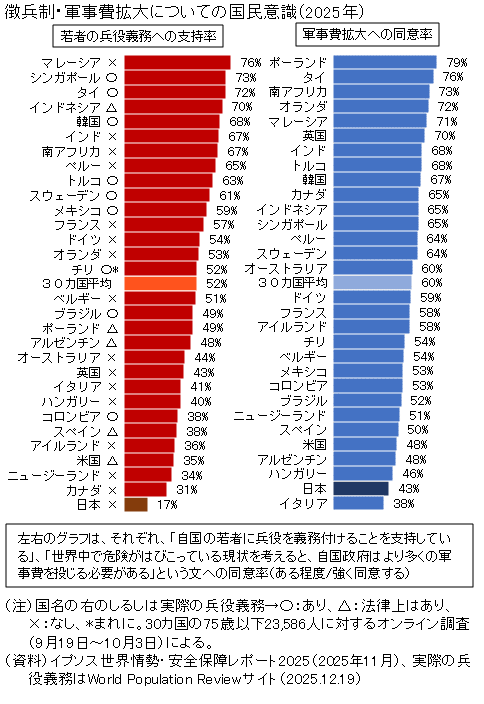(徴兵制) 徴兵制については、具体的には若者への兵役義務付けを支持するかという問を設けている。 若者への兵役義務についての支持率が最も高いのはマレーシアの76%であり、これに次いで、シンガポール、タイ、インドネシアが70%台で続いている。調査対象国のうち東南アジアに属する4か国がトップ4を構成しており、人的側面の国防意識につては東南アジアで特に高いことがうかがわれる。 東南アジア4カ国に次いでやはりアジアに属する韓国が68%、インドが67%で続いている。 こうしたアジア勢に続いて、中南米、欧州の諸国があらわれる。 欧米諸国の中ではスウェーデンが61%と最も高く、フランス、ドイツ。オランダが50%以上で続き、オーストラリア、英国、イタリアは40%台、さらに米国、ニュージーランド、カナダは30%台とかなり低くなる。 米国での若者の兵役義務支持率は35%と世界の中でもかなり低いレベルであることは覚えてよいデータであろう。米国は世界中に米軍基地や原子力空母を展開し、その軍事的影響力を保っているが、国防意識と直結した考えからではないことがうかがわれる。 そして最下位なのが日本の17%である。日本に次いで低い米国、ニュージーランド、カナダといった英語圏諸国が31〜35%だったので、日本はその半分の非常に低いレベルとなっている。 よく引用される世界価値観調査の「もし戦争が起こったら国のために戦うか」という設問への答でも日本は最下位である(図録5223)。 最後に、こうした徴兵制への意向にあらわれた国防意識の強さが、国名の右に〇×△で示した実際の徴兵制の施行とどう関係しているかを見ておこう(各国の実際の徴兵制については下表参照)。実際に徴兵制をもつ国の方が国防意識が高いかというとグラフの上の方ほど〇が多く、下ほど×が多いことから全体的にはそう言える。 ただ個別には両者が対応している訳ではない。国防意識が最も高いマレーシアやかなり高いインドや南アフリカなどは徴兵制をもたない。逆に徴兵制をもつコロンビアや法的には徴兵制を発動可能なスペインや米国では国防意識は低いのである。 なお、徴兵制については、冷戦が終結し、ロシアが米欧と接近したのを受けて、21世紀に入ると徴兵制をやめる国が相次いだ。フランスは2001年、イタリアは05年、ドイツは11年にやめた。だが、ロシアが14年にウクライナ南部クリミア半島を一方的に併合したのが転機となり、ロシアの軍事的脅威に敏感な国を中心に復活の動きが出ている。フランスはテロの脅威を理由により2019年新学期開始時に「普遍的国民奉仕」として導入したり、リトアニアのようにロシアによるクリミア併合によるロシアの脅威を理由に徴兵制へ戻すなど、徴兵制を復活させている国もある。 (軍事費拡大) ロシアによるウクライナ軍事侵攻、イスラエルのガザ地区侵攻に伴う東欧・ロシア圏や中東の安全保障上の情勢悪化で世界各国で国防意識が刺激され、軍事費拡大への賛意も高まっている。 30カ国平均でも60%が軍事費拡大に同意している。これは若者の兵役義務への支持率よりも高い値であり、また各国の差もより小さい。 最も軍事費拡大への同意率が低いのはイタリアであり、 日本がそれに続いているが、それでも、それぞれ、38%、43%前後と約4割が賛成している。 逆に最もそれが高いのはポーランドの79%であり、タイが76%で続いている。欧米主要国でもオランダや英国では7割以上が拡大に賛成している。 米国は軍事費拡大への賛意は48%と5割程度に止まっている。米国ばかりが軍事費を負担せず、NATO諸国や日本、韓国など同盟国により多くの軍事費を負担してもらおうと言う意識のあらわれと思われる。 主要国における実際の軍事支出の対GDP比率の推移を見るとこの点がはっきりしている(軍事支出の対GDP比率の推移は図録5219参照、近年の上昇傾向も明らかである)。