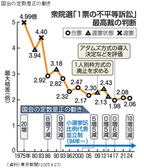 (2010年12月8日収録、12月17日参議院の推移表追加、2011年1月26日判決例追加、3月1日更新、3月23日2009年衆議院選最高裁判決追加、3月24日コメント追加、2012年10月18日更新、2013年3月7日更新、3月25日・26日コメント追加、11月20日更新、11月28日更新、2014年11月26日更新、12月16日更新、2015年7月26日参議院公職選挙法案可決関連、コラム追加、11月25日更新、11月26日資料を毎日新聞から東京新聞へ変更、2016年10月17日16年7月参院選の倍率更新、2017年9月27日更新、2018年12月20日更新、2020年11月19日更新、2022年2月2日更新、3月9日高裁判決出揃い、2023年1月25日衆院選裁判最高裁判決、1月29日アダムズ方式解説や図解追加、10月18日参院選裁判最高裁判決、2025年9月27日更新)