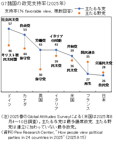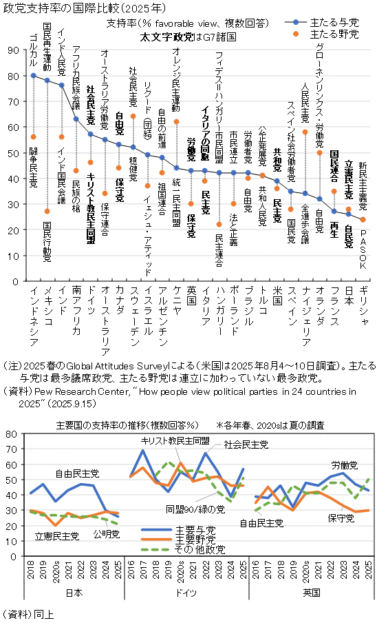 一般に、政党支持率といえば、支持している政党名、あるいは支持する政党がないという選択肢を含め1択で回答した結果である場合が多い。日本の新聞・テレビで報道される政党支持率はすべてそうしたデータである。小選挙区はA政党の政治家、比例区はB政党と複数の政党を支持している場合でもどちらかを回答しなければならない。この場合、回答結果は合計すると100%となる。 ピューリサーチセンター調査の政党支持率はこれとは異なっている。各政党について支持している(faborable)かどうかを別々に聞いているので、複数回答結果を同じとなり、合計が100%を越えることがありうるデータなのである。 また、ここで主たる与党(main governing)政権党か連立政権の場合は最大の議席数の政党を指し、主たる野党(main opposition)は政権党(連立政権党)以外の野党のうち最大の議席数を有する政党を指している。調査は各国で最低限この2党を対象としている。 グラフの国の並びは、主たる与党の支持率の高い順である。インドネシアのゴルカルの80%からギリシャの新民主主義党の24%まで支持率の高さの差は国ごとに大きい。 主たる与党の支持率と主たる野党の支持率を比べると、当然ながら、概して、主たる与党の支持率の方が高い。ケニヤ、ナイジェリア、オランダ、フランスにように逆転している場合も少なくはない。日本も主たる野党の立憲民主党の28%が主たる与党の自民党の26%を上回っている。こうした逆転ケースの目立った国について、そうした状況が生じた事情を後段にまとめてコメントした。 参考のため日本、ドイツ、英国について時系列推移を主な与野党2党とその他主要政党について示した。主な与野党2党にその他主要政党が匹敵、あるいは凌駕する支持率を示している場合があるが、小選挙区選挙での獲得議席は必ずしもこの支持率に比例するものではない点に留意する必要がある。例えば日本において、最大与党自民党の支持率が最近大きく低落し、最大野党の立憲民主党を下回る年次も出てきているが、議席数は自民党の方が大きく立憲民主党を凌駕している。 各国の政党事情について、おおむね図の順に以下でコメントしていこう。資料としてはウィキペディアのほか、山中俊之(1924)「教養としての世界の政党」、水島治郎(2016)「ポピュリズムとは何か」などを参照した。なお、主要先進国については、以下に上図からの抜出を掲げるだけとし、各国の推移データとともに図録5230mで政治情勢をコメントしたので、そちらを参照のこと。 ![]() 日本はフランスとならんで主要な与党と最大野党の支持率が総じて低い点が目立っている。政党不信の状況が著しい国だと言えよう。 (インドネシア) インドネシアではスカルノとスハルトという歴史的な役割を果たした軍出身の過去の2人の大統領の政治勢力が対立軸として存続している。ゴルカルはスハルト系の政党であり、大衆寄りの保守政党、闘争民主党はスカルノ系で大きな政府を目指している。複数回答とはいえ、それぞれの政党の支持率の合計が100を大きく上回っているところに両党の存在感の大きさがうかがえる。2024年の大統領選で闘争民主党のジョコ前大統領が破れ、ゴルカルのスビアント新大統領が就任した。 インドネシアだけでなく、フィリピンではマルコス家の国民党、アキノ家の自由党、インド国民会議派のガンジー家(ネルーの娘の姓)などアジアでは名門政治一族が力をもつ傾向がある。 (メキシコ) 国民再生運動(Movimiento Regeneracion Nacional、 MORENA、モレナ)は、 メキシコの左翼政党である。2018年から24年まで大統領を務めたアンドレス・マヌエル・ロペス・オブラドールが主導している。ウィキペディアによれば「モレナの政策綱領は、左翼ポピュリズム、進歩主義、社会民主主義の要素を組み合わせている。モレナは、新自由主義的な経済政策に反対し、社会福祉プログラムの拡充、インフラへの公共投資の増加、エネルギー、石油、電力などの戦略的産業の国家管理を支持している。モレナは、労働者階級の有権者、農村地域、都市部の貧困層、歴史的に連邦政府の投資が不十分だった地域から多大な支持を集めており、長らく優勢を占めてきた制度的革命党(PRI)と保守的な国民行動党(PAN)に代わる政党としての地位を確立している」。 (南アフリカ) 1994年、初のすべての人種による選挙が実施され、ネルソン・マンデラの政党「アフリカ民族会議」(ANC)が圧勝。それ以後も非常に大きな影響力を保っている。民族の槍(MK)は、南ア最大の民族ズールー族の前大統領ジェイコブ・ズマがANCのトップでもある現大統領シリル・ラマポーザと敵対し旗揚げした新党。ANCに対する「復讐」との見方もある。 (オーストラリア) オーストラリアではリベラルな労働党と保守連合(自由党と国民党からなる)が政権交代を繰り返している。英国の労働党と保守党との関係に類似。 (カナダ) 単純小選挙区制の下院の最多政党のトップが通常は首相となる。伝統的にリベラ