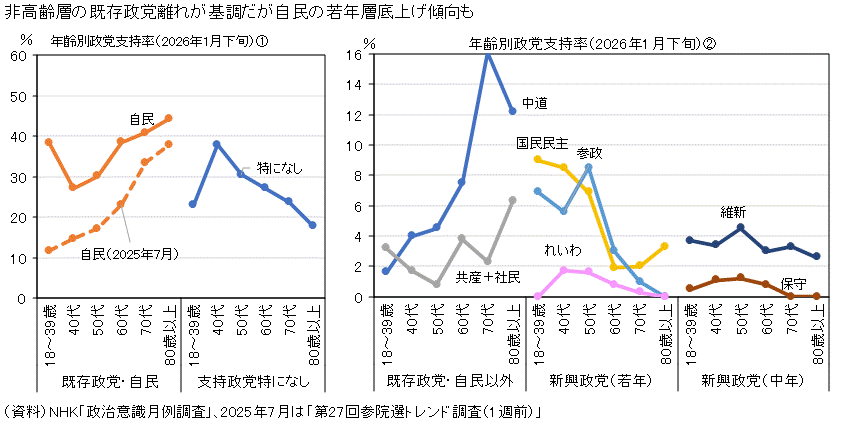 高市政権(自民・維新連立政権)となって自民の支持率が全体に上昇している。これは特に若い層で国民民主や参政の支持層をシフトさせているからと思われる。立憲民主と公明がつくった中道はやはり既存政党と同様中高年が支持。これらを除くと2025年7月の状況とそう大きくは変わっていない。 (2025年7月:参院選1週前) 自民党に代表される旧来型の政党を既存政党とすると2025年7月の参院選を特徴づけているのは、既存政党への信頼が失墜し、既存政党以外の政党への期待が高まった点にある。 こうした動きの背景としては、裏金問題や不適切発言など、自民党という長期的に政権を担ってきた既存政党の不祥事が相次いでいるからというより、社会の機能不全の認識(社会が壊れている!)から、旧来型の政党ではそもそも国民の期待に応えることが無理なのではないかという認識が国民の間に広まっているからだと考えられる。 ここでは、既存政党と新興政党の違いについて、政党を支持する年齢層の違いから明らかにしておこう(NHK調査の原データ)。 既存政党の代表格である自民党は年齢があがるほど支持率が上昇する。参院選1週前の時点での年齢別の政党支持率をあらわした上図からもこの点は明らかである。 これを見ると自民党の支持率は50代までは10%台に過ぎないが、70代以上では35〜40%となっており、年齢傾斜が特徴的である。若者の保守回帰が、以前、話題となったが、そういう状況には現在はなっていない。少なくとも、保守回帰があるとしても自民党には向かっていない。 なお、選挙期間中は政権党以外の政党の情報もマスコミを通じて多く流されるため、政権党の支持率は低下するのが通例である。この図でも6〜7月の月例調査から投票日1週間前にかけて各年齢で自民党の支持率が低下しており、それが新興政党に流れたと考えられる。 支持政党が「特になし」と回答したいわゆる無党派層は自民党とは逆に若年層ほど多い右下がりの傾斜を示している。 既存政党離れを起こしている有権者は、一方で無党派層を形成するとともに、他方で新興政党支持に向かっている状況が明らかである。実際の選挙で無党派層の票が既存政党に流れるのか、それとも新興政党に流れるのかで結果が決まってくるというのが定番の選挙予想であるが、年齢的な構造からは、当然、新興政党に多く流れるに違いない。投票率の高低がその程度を決めることになるのである。 年齢があがるほど支持率が上昇するのは、自民党だけでない。古くからの政党である公明党や共産党・社民党も同様である。これらもまた既存政党と言うべきだろう。 一方、立憲民主党も同様の傾向が目立っている。立憲民主党と国民民主党は両方ともかつての民主党から生まれた政党であるが、国民民主党は年齢層が若いほど支持率が高く、立憲民主党とは正反対の性格を有している。生まれた時期は同時期でも、支持層の違いからは、立憲民主党は既成政党、国民民主党は新興政党と位置づけられよう。 年齢があがるほど支持率が上がる政党を既存政党、それ以外を新興政党と位置づけると、新興政党も実は2分される。 すなわち、一方で、若年層ほど支持率が高いのが国民民主党、参政党、れいわ新選組(注)。他方で、若者と言うより中年以上の支持が特徴であるのが日本維新の会、日本保守党という2区分である。 (注)ただし、れいわ新選組の18〜39歳層の支持率は参院選2〜3週前には各年齢層のうちで最多だったが、直前1週目には落ち込んだ。参政党に若年層からの支持が食われた格好である。 既存政党にも左右両派の政党があるように新興政党にも左右両派の政党が属している。れいわ新選組は左派系であるが、今回注目の的となっている「日本人ファースト」をうたう参政党は日本保守党とともに、むしろ、保守的な政見をもっている。 就職氷河期に安定雇用を逃した困窮層や財務省デモ参加者などでは、消費税廃止という共通の公約に賛同し、左右に関係なく投票先、れいわ、参政党2択になる傾向があるとの取材報道もある。こうした層では消費税廃止をトーンダウンさせた国民民主の影は薄くなっているという(東京新聞2025.7.13)。 新興政党の中には、党首に注目が集まったり、党首の発言がセンセーショナルだったりするポピュリスト的な性格の政党が目立つ。世界的な潮流ともなっているポピュリズム政治がわが国にも波及するかに関心がもたれている(この点に関するプレジデント・オンラインの私の記事はここ)。 なお、既存政党と新興政党との違いは、新興政党で男性の支持率が女性の支持率より高くなっている点にもあらわれている(下図)。女性は新規性の高い政治潮流に対して男性より懐疑的なのであろうか。 ![]() 実際の参院選では、ここでふれた新興政党が大きく躍進し、既存政党はすべて落ち込んだ。こうした状況を比例票の推移から図録5231で見ているので参照されたい。 (2025年7月22日収録、12月26日最新追加、12月27日12月値から11〜12