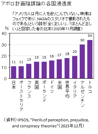 フェイクニュースを「捏造されたニュース・情報」と捉え、それが大問題になっているかを各国の国民にきいた意識調査の結果を掲げた。 調査対象となった35か国中、大問題になっていると回答したものが8割以上の国が26か国にのぼっており、多くの国でフェイクニュースが大問題になっていることが分かる。 同回答率が最も高かったのは韓国、タイの92%であり、ドイツ、ブラジルが91%、ギリシャ、日本、トルコ、チリ、ペルーが90%で続いていた。 先進国、途上国を問わず、また欧米かどうかや文化圏を問わず、世界的にフェイクニュースが大問題となっていることがうかがえる。フェイクニュースの本場に見える米国は同回答率が85%と特に高いわけではない。 一方、同回答率が50%と目立って低いのはシンガポールである。シンガポールではフェイクニュースを禁止する法規制(以下の記事参照)が厳しく、運用されているためと思われる。 表現の自由への侵害という批判を受けながらも、シンガポール政府は、2019年に、フェイクニュースが宗教的不和をもたらす可能性があるため厳しい法律が必要だという理由でフェイクニュース禁止法を導入した。同法では、政府が公益に反すると判断した情報の拡散を防ぐ。虚偽情報を拡散した者には重い罰金が科せられるほか、最大5年の禁錮刑となる場合もある。また、フェイクニュースを拡散するためにボットや偽アカウントを使用した場合、最大100万シンガポールドル(約8100万円)の罰金と、最大10年の禁錮刑が科される。さらに、オンラインプラットフォームやソーシャルメディア、ニュースサイトなどにも適用され、虚偽情報の削除や訂正文の掲載に従わなかった場合には運営側に罰金が科せられるという(BBCニュース2019.5.10)。 日経新聞(2023.11.19)の有識者記事によると、シンガポールでは2019年に「オンライン虚偽情報・情報操作防止法」(POFMA)を導入したが、この「通称フェイクニュース法によって、政府はオンライン上の虚偽の報道を削除するよう命じられるほか、元の報道と一緒に訂正記事の掲載を求めることができる。POFMAにより、シンガポール国民はデマと事実を区別しやすくなった。 シンガポールは偽情報や誤報による危うさが強まるにつれて、さらなる安全策を取り入れている。21年には海外からの干渉が疑われる場合、当局がオンラインのコンテンツへのアクセスを禁止する「外国介入対策法」を導入した。昨年7月にはソーシャルメディアへの規制も強化した。当局が有害コンテンツの削除を求められるほか、未成年の利用者に対する保護を要求する権限を付与した」。 参考に、下図にフェイクニュースの事例としてアポロ計画陰謀論の各国浸透度を掲げた。世界平均で18%の人がこれを信じている。日本人は11%と少ないがトルコ人では驚いたことに34%と3分の1を越える人が本当だと思っている。 ![]() (2025年6月8日収録、10月29日アポロ計画陰謀論の各国浸透度)
