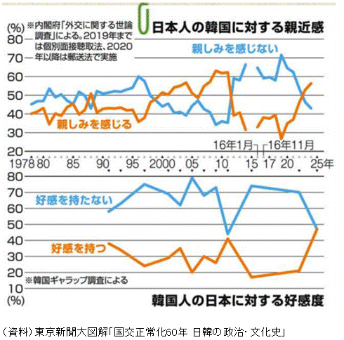 韓国に関して、03年から04年にかけては55.0%から56.7%のかなりの上昇となっている。「ヨン様ブーム」「韓流ブーム」が反映していると考えられる。 ところが、05年には、中国と同じ小泉首相靖国参拝問題、そして竹島(独島)領有権問題が影響して、51.1%とかなりの低下となった。 2006年は、安倍首相が首相就任直後に中韓訪問(10月8日〜9日)を行って関係改善に乗り出したにもかかわらず、なお、割合が低下している。これは、中年層は親しみを感じる人が回復したが、若者層を中心に親しみを感じる人が減っているからである。 2007年は若者層の人気回復により54.8%と再度親しみを感じる人が多くなっている(図録8855参照)。調査月の前月末に積極的なアジア外交をかかげる福田政権が新たに誕生した影響もあろうが、中国は目立って回復していないのでむしろ親韓基調が再現したと見た方がよかろう。日韓各地17カ所で行われた朝鮮通信使400周年記念の再現行列(図録3999)が影響している可能性もある。 2008年は、7月に学習指導要領解説書に「竹島」を明記され、韓国側が反発し、米国産牛の輸入再開問題から引き続く李明博政権への批判もあって韓国ではかなりの騒動となったが、日本側は若者は別にして全体としては余り気にしておらず、むしろ李明博新大統領の日本公式訪問、天皇皇后両陛下と会見(4月)もあってか「親しみを感じる」比率は過去最高となった。 2009年は前年に引き続き値が上昇し、韓国に親しみをもつ者ははじめて6割を越えた。ウォン安による観光交流の拡大の影響もあろう。中高年齢層での値の上昇が目立っている(図録8855参照)。 2012年は8月の李明博大統領による天皇の反日独立運動家への謝罪要求(訪日の条件として)及び島根県・竹島上陸などの影響で親しみは急降下、15年ぶりに3割台に落ち込んだ。2013年も朴槿惠(パク・クネ)新大統領が親日家と見なされるのを恐れて対日強硬姿勢を崩しておらず、なお、親しみは落ち込んだまま。 13年12月に安倍首相が靖国参拝を行ったのを受けて、2014年も、朴槿恵(パククネ)大統領による従軍慰安婦問題でのかたくな態度、あるいは産経新聞ソウル支局長が書いた大統領記事についての在宅起訴などによって日韓関係がさらに悪化。これを反映して親しみは中国と同様に過去最低にまで低下した。韓流ブームなどで一定期間親しみが増していただけにこの落ち込みは目立っている。 2015年12月に慰安婦問題で日韓が合意したが、2016年1月と11月の結果はやや反転程度であり、国民感情への影響は限定的だったようだ。ただその後はやや回復傾向にある。 2018年には10月に韓国人の元徴用工による損害賠償請求訴訟で韓国最高裁が新日鉄住金の上告を棄却、賠償命令が確定(1965年日韓基本条約に伴う請求権放棄合意違反)、11月には韓国が慰安婦問題に関する日韓合意に基づき設立された「和解・癒やし財団」の解散手続きに入ると発表し(日韓合意事実上破棄)、さらに12月には自衛隊機に対する標的レーダー照射事件と日韓関係は悪化した。 さらに2019年には8月には、日本が貿易上のホワイト国から韓国を除外したのに対して、韓国が日韓で防衛秘密を共有する日韓秘密軍事情報保護協定(GSOMIA)の破棄を決定するなど日韓関係はさらに悪化し、改善へ向けたきっかけもつかめないでいる状況である。 こうした状況を反映して、2019年10月には26.7%と過去最低の水準にまで急落している。2020年はやや回復したが、元徴用工訴訟問題などでなお水準は低い。 2022年には、韓国で5月に前政権の対日政策を見直すとしたユン・ソンニョル大統領が就任して、値が上昇した。2023年も日韓関係の改善によって引き続き上昇した。 年代ごとの落ち込み具合については図録8855参照。 内閣府世論調査の日本人の対韓国親近感の推移とともに韓国ギャラップ調査による韓国人の対日本好感度の推移を比べてみると(下図)、親しみレベルとしては後者の方が低いが、高低の波は並行的であり、また日本人の対韓国の親しみが上昇するのに少し遅れて、韓国人の対日本の親しみが上昇する傾向があると認められよう。 ![]() (4)その他 ロシアに対する親近感は旧ソ連時代から低いままだが、2020年は北方領土交渉の停滞などからさらに低下した。2022年には、2月にロシアによるウクライナ軍事侵攻がはじまり、親しみ割合は2022年、23年は続けて過去最低を更新している。 一貫して評価の低い日本と異なり、西欧諸国では対ロシア評価は高評価から低評価への大きな起伏を見せている点については図録8989参照。 なお、各国に対する世代別の動きは図録8855、韓国側から日本は親しみを感じるかの結果は図録8005参照。 (2004年12月21日更新、2005年12月31日更新、2006年12月11日更新、2007年12月3日更新、2008年12月8日更新、2009年12月21日更新、2010年12月20日更新、2011年12月5日更新、2012年11月24・25日更新、2013年11月25日更新、2014年12月20・21日更新、2016年3月14日更新、図にロシア付加、2017年1月7日更新、12月26日更新、2018年12月23日更新、12月31