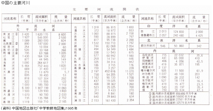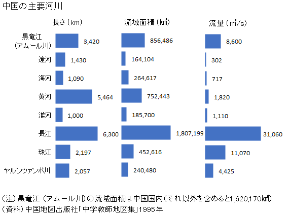中国の水系は、外洋に流出する「外流区」と内陸で完結する「内流区」に大きく分かれている。 外流区の中には太平洋に流出する太平洋流域のほかに、インド洋流域、及び北極海に流出する北極海流域がある。 太平洋流域には、中国沿海部に流出する黄河、長江などのほか、東南アジアを経て南シナ海に流出するメコン川の上流部がある。インド洋流域にはミャンマーを経てインド洋に流出するサルウィン川(怒江)やイラワジ川、インドを経てやはりインド洋・ベンガル湾に流出するプラマプトラ川・ガンジス川の上流部がある。インダス川に流出する上流域もある。さらに、ロシアを経て外海に流出する河川の上流部にあたる北極海流域もある。 中国は東流する大河川の黄河、長江(揚子江)で形作られているイメージが強いが、このように南や北に向かって外洋に流れ出す河川の上流部も有しており、まことに大陸国としてのスケールを示している。 中国北部の河川と比較して中国南部の河川は流域の降水量の多さから流量も大きい。 中国の河川トップ3は、長さでは長江、黄河、黒竜江、流域面積では長江、黒竜江、黄河、流量では長江、珠江、黒竜江の順である(下図参照)。 ![]() ![]() (2026年2月3日収録)