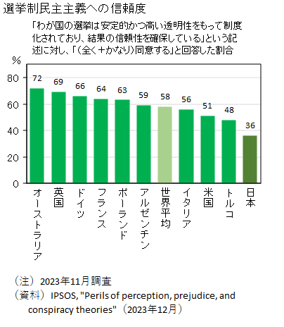 パリに本社を構える世界的なマーケティング・リサーチ会社であるイプソス社の「世界情勢・安全保障レポート2025」では、この点について世界30カ国で調べた調査結果が掲載されていたのでグラフにした。 これは、「民主主義・人権・法の支配」は普遍的な価値なのか、それとも西洋固有の価値なのかを聞いたものである(注)。 (注)設問の原文 Q: Which of the following is closest to your point of view: (1) Democracy, human rights and the rule of law are “Universal Values” that all nations deserve and can aspire to. (2) Democracy, human rights and the rule of law are “Western Values” and only possible in those countries. どちらを選択するにせよ、西洋に属する国とそうでない国とでは、回答結果の解釈に違いが出ると考えられるので、図では、地域を西洋と非西洋に分け、それぞれで、普遍的な価値と回答した比率の高い国順にソートした。 Westernを西洋的と訳したが、欧米的とも訳せる。一般に、Western worldまたはthe Westは、西欧と北米とオセアニアを指すが、東欧と中南米も同類ととらえらることが多い(Wikipediaの”Western world”参照)。東欧は西洋かもしれないが、ロシアとなると西洋かどうか怪しくなる。 図の地域区分は、同類を含め西洋とそれ以外のアジア・アフリカ諸国を非西洋に2区分した。ロシアは対象国でないのでどちらに含めるか悩まなかったが、もし対象国だとしたら価値観的な観点からロシアは非西洋に区分することになったろう。 全体的な結果は、「民主主義・人権・法の支配」が世界中で普遍的な価値として受け止められているというものだ。30か国平均では、83%が普遍的な価値と認め、残りの17%が西洋的価値だと判断している。 普遍的な価値と見なす割合が最も高いのコロンビアの92%であり、インドネシア、韓国、ペルー、メキシコがこれに次いでいる。 逆に、普遍的な価値と見なす者が最も少ないのは、インドであり、日本がこれに次いでいる。インドでは42%が、日本では27%とかなりの割合の者がそれを普遍的な価値でなく西洋的価値と見なしているのである。 西洋に属する国々のなかでも、英国、フランス、ベルギー、アイルランドは、案外、それを西洋的な価値だと見なす者が21〜23%と多い(非西洋でもインド、日本を除く国より多い)。こういった近代民主主義の祖国とも呼ぶべき国を含む西ヨーロッパの中心国では、非西洋諸国では「民主主義・人権・法の支配」を本当に理解して導入しているのか疑わしいと考えている者も多いと考えられる。 西洋諸国の中でも、普遍的価値と信じる者が多いのは、中南米や東欧といった西洋の中では中心部とはいいがたい地域であり、ドイツ、米国などは、むしろ上の中心国と同様、西洋的価値と見なす者が多い傾向である。 非西洋諸国に目を転じると、インドや日本を除くと、「民主主義・人権・法の支配」を普遍的な価値と見なす者が西洋諸国よりも、むしろ、多い。特に、インドネシア、韓国、タイといった戦後、非民主主義的な軍事独裁を体験した国で、特に普遍的な価値と信じる者が多くなっているのが印象的である。西洋中心国から、それを分相応のものでないと見なされたくないからかとも思われるほどである。苦労して民主主義を導入したことを憶えている国民が多く、それが西洋的価値にすぎないとは認めたくないという気持ちのあらわれかもしれない。 逆に、民主主義国としての歴史の長い日本やインドで西洋的価値だと考える者が比較的多いのは、それはもともと自国で発達した制度や概念ではないという正直な気持ちがあらわれているからだとも思える。 下図のように選挙制民主主義への信頼度が日本は欧米と比べて低いのも同じ理由であろう。 ![]() わが国では、安倍晋三氏が第1次政権の2007年に、中国、ロシアと対抗して友好国との関係を深めるため、自由、民主主義、人権、法の支配といった普遍的価値や原則を重視する「価値観外交」を唱え始め、馴染み深い用語となっている。しかし、そうであるにもかかわらず、インドネシアや韓国などと比較しても、国民意識ではこうした概念を普遍的な価値として認める者はそれほど多くないと言うのは、かなり皮肉な結果である。 残念なのは、ロシアや中国が調査対象国となっていない点である。 民主主義に対する日本人のクールな見方は下図のようなデータにもあらわれており、興味深い(図録j047参照)。 ![]() (2025年12月9日収録、2026年2月13日選挙制民主主義への信頼度、民主主義信奉度)
