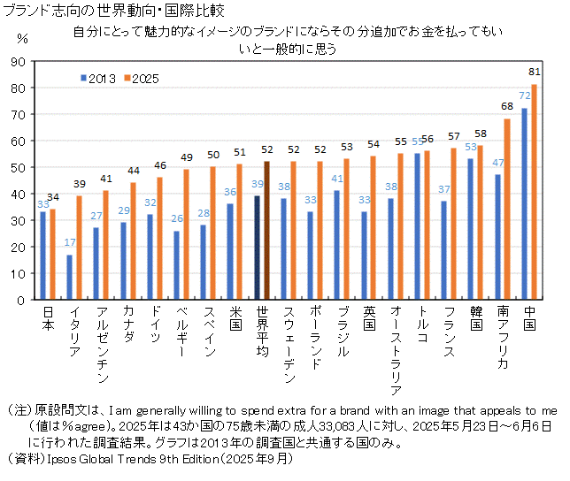 自分らしさをアピールするためのブランド志向が世界的に高まる傾向。地域別にはブランド志向がもっとも高い中国人、もっとも低い日本人。 |
