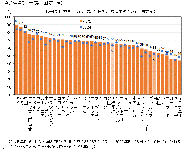 未来への不確実さが増している中、「今を生きる」主義が各国で主流に。特にタイ、香港、中国、ヨーロッパではフランスなどでそうした傾向が強い(日本、韓国やドイツ、イタリアはそうでもない)。 |
