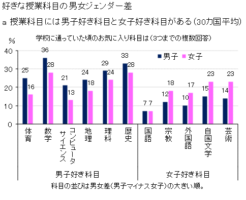 数学や歴史は男子好き、外国語や文学、芸術は女子好きと好きな教科には男女による違いがあるが、そうしたジェンダー差は世界的に縮まる傾向 |