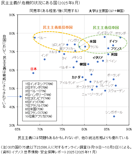 欧米先進国ではオランダ、ドイツ、フランス、米国などで民主主義の危機が意識されている。それ以外ではインドネシア、ペルー、ハンガリーなどで民主主義への危機感が強い。 |