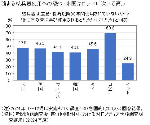 ロシアでは7割、米国では48%の国民が核兵器が使用される恐れを頂いている。