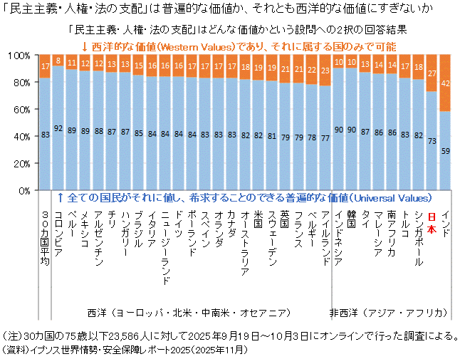 世界の8割以上で「民主主義・人権・法の支配」はすべての国民が享受すべき普遍的な価値と考えているが、アジアでは日本人の27%が、インド人の42%が西洋的な価値に過ぎないと考えている。 |